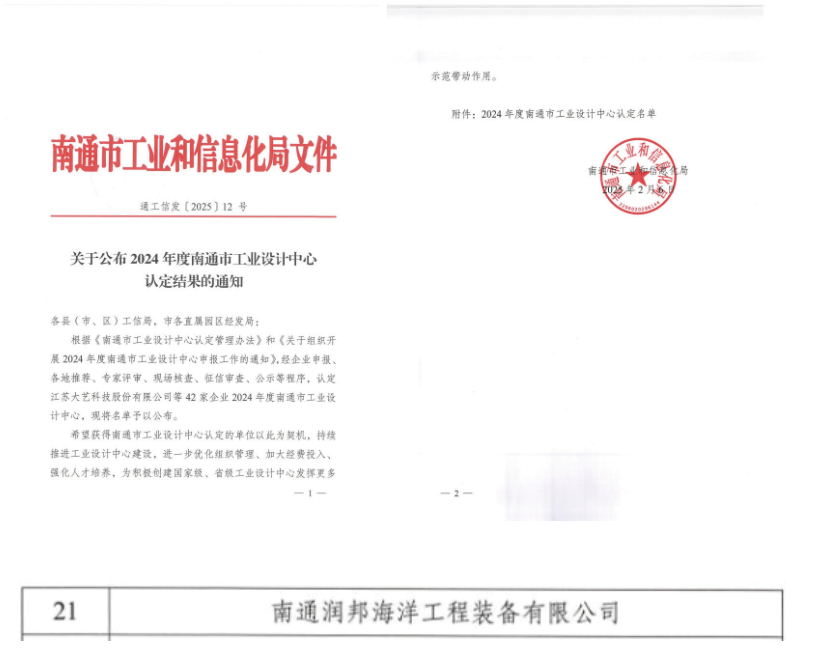 近日,南通市工業和信息化局公布2024年度南通市工業設計中心認定結果的名單,子公司潤邦海洋經過專家評審、現場核查、征信審查等程序,最終被認定為2024年度南通市工業設計中心。此次設計中心的認定是對潤邦海洋創新能力、設計水平及服務能力的認可。