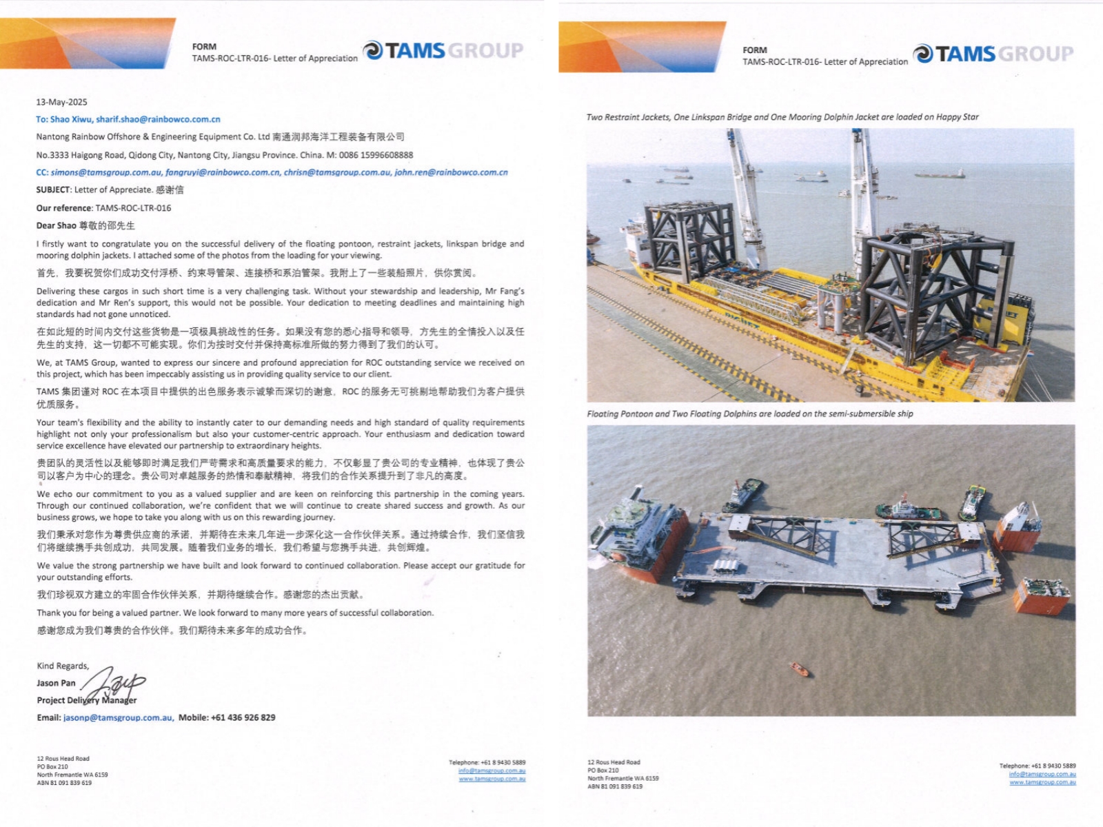 Recently, Rainbow Offshore has received a letter of appreciation from TAMS Group of Australia, in which TAMS highly praised Rainbow Offshore’s excellent efforts for KMSB Floating Pontoon project. This marks that Rainbow Offshore has once again won the deep recognition of a heavyweight customer in the international high-end offshore engineering equipment market.